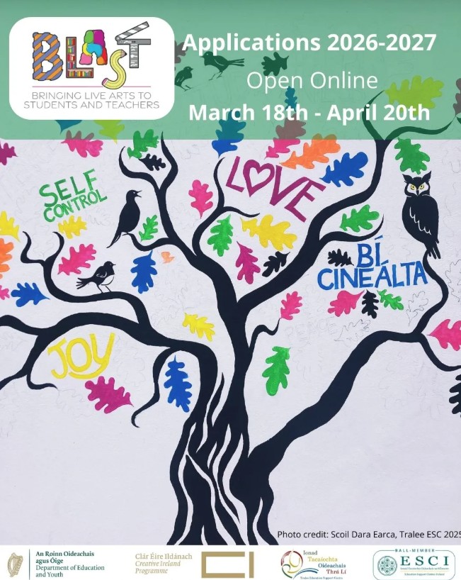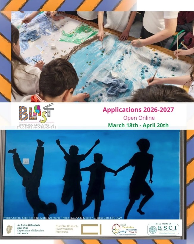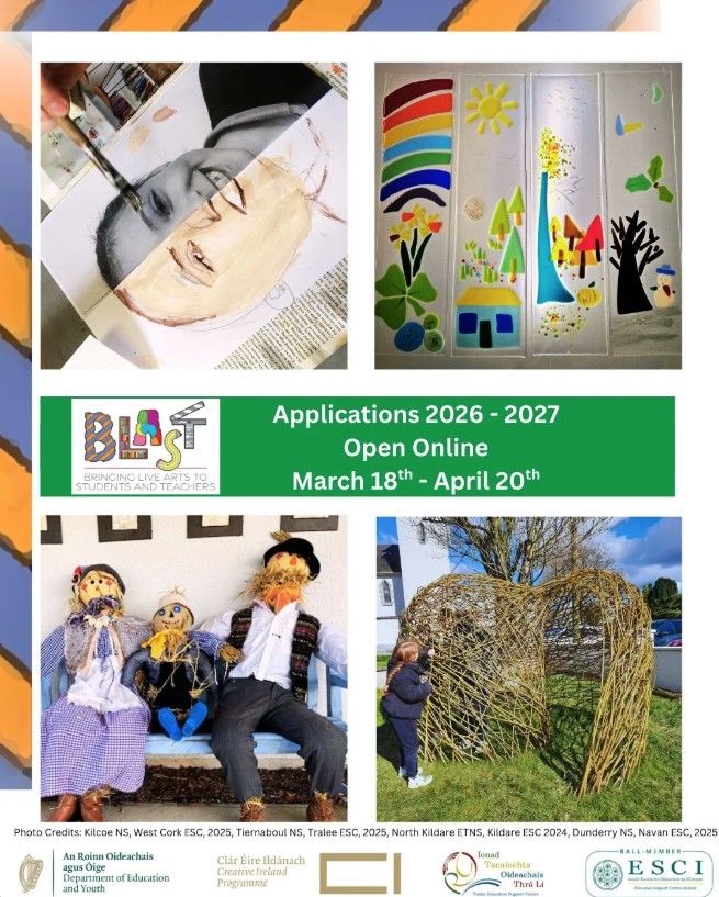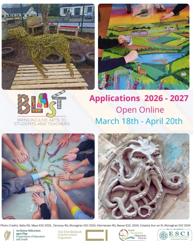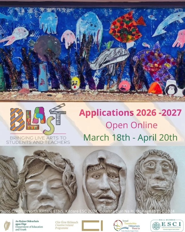 Pupils in schools all over the country work with professional artists/creative practitioners on imaginative and joyful projects. BLAST gives them the time and the space to design and develop innovative residencies meant to foster their creativity and to develop their collaboration skills, critical thinking and problem-solving abilities. BLAST is a key initiative of the Department of Education and Youth, part of the Creative Youth Plan 2023-2027. It is run by the Education Support Centres Ireland (ESCI) network through all its 21 full-time education centres and coordinated nationally by the National Arts in Education office at Tralee Education Support Centre