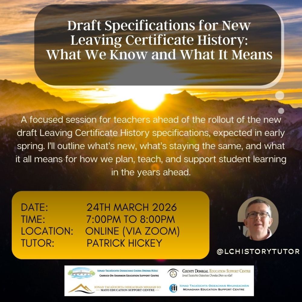 A focused session for teachers ahead of the rollout of the new Leaving Certificate History specification, expected in early spring.