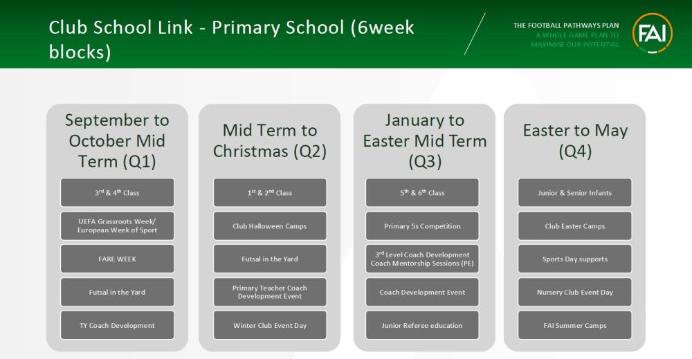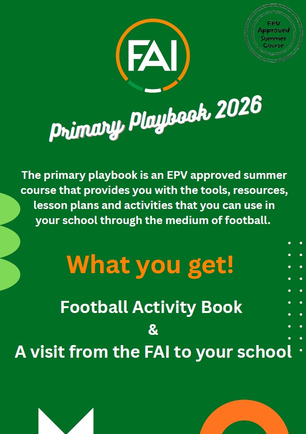 This 5 day EPV approved summer course will be delivered by one of the FAI Club & League National Leads, Brian Dorrian. This collaboration allows for the FAI staff to create direct links with the school, teachers and the clubs within the locality of the school, from a League of Ireland (LOI) and a Grassroots perspective. This collaboration allows for continued support after completing the summer course through the FAI Club School Link’s programme, which is attached as a sample of the continued support we can provide to the teachers who participate in the 2026 summer courses with the FAI.