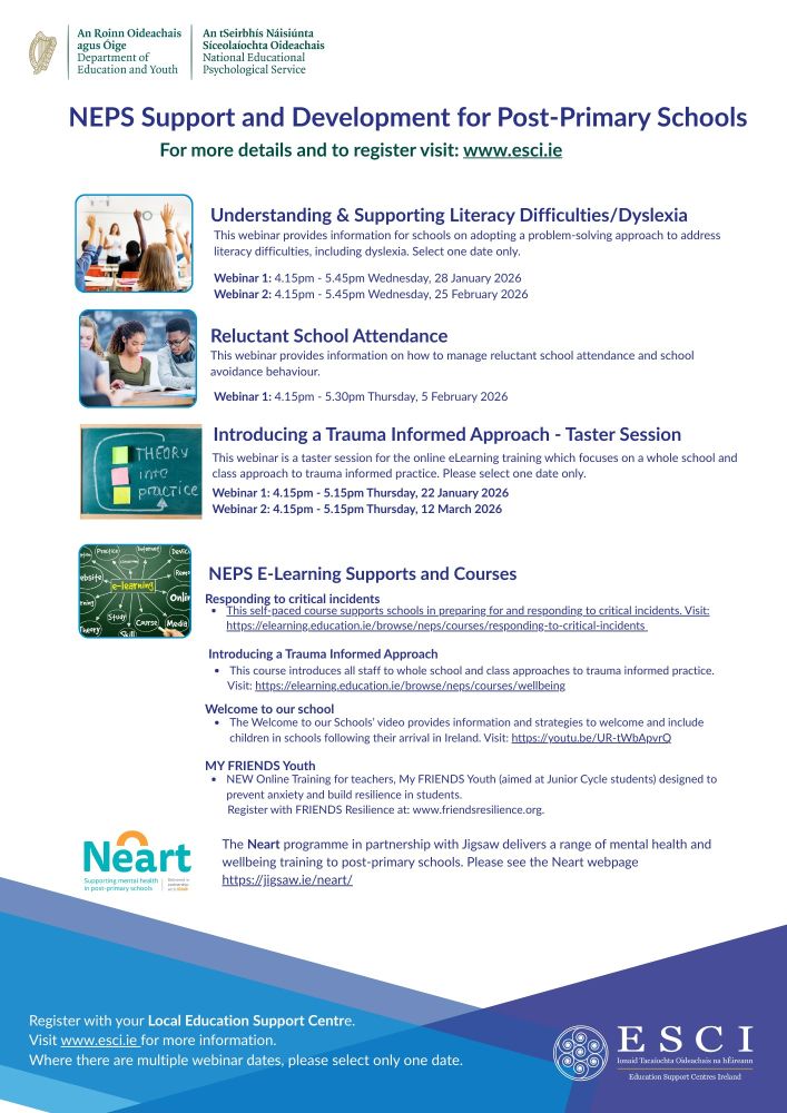 The focus of the NEPS Support & Development Service is to help enhance school systems, to maximise a whole-school approach to creating school environments that are inclusive, flexible and responsive to the needs of all and to build school capability to provide evidence-informed prevention and early intervention support as part of the Continuum of Support framework. This work also includes supporting schools to respond to Critical Incidents.