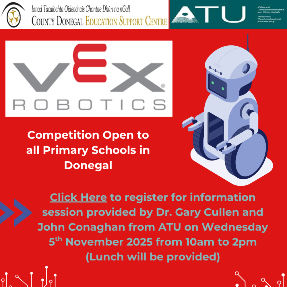 This is open to all Primary schools in Donegal, so even if your school has not previously participated in a VEX Robotics competition you can still attend and find out more about it and there will be hands-on demonstrations provided by our colleagues