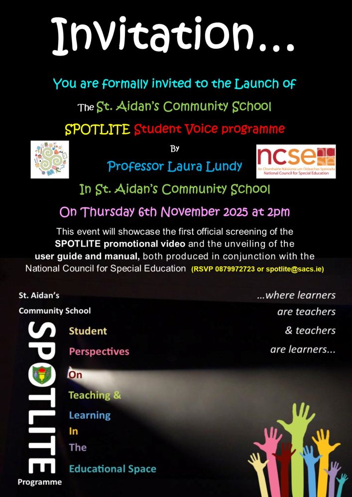 We are thrilled to announce the official launch of the St. Aidan's Community School SPOTLITE Student Voice Programme by Professor Laura Lundy, on Thursday November 6th 2025 at 2pm in St. Aidan's Community School, Brookfield.